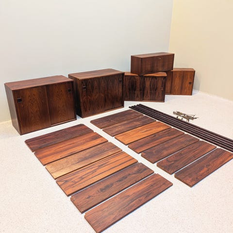 Ps reolsystem designet at Preben Sørensen. Produceret i Danmark. Fineret teaktræ. Design nr: B 3309