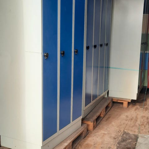Blika garderobeskab med 4 rum i blå farve. Skabet har fire separate aflåselige rum med individuelle døre. Hvert rum er indrettet med bøjlestang og knager til ophæng af tøj samt perforeret bund. Egnet til brug som omklædnings- eller garderobeskab i fx værksted, institution eller lignende miljøer.