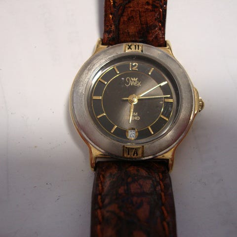 Inex damearmbåndsur med lille rund urkasse i guldfarvet metal og lys skive. Uret har analoge visere og markeringer for timer. Remmen er i brun læder med klassisk lukning. Velegnet som kvindeur til daglig brug eller som enkelt smykkeur.