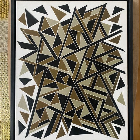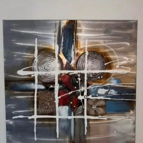 Maleri til ophæng på væg. Motivet er et farverigt, grafisk billede i stærke kontrastfarver. Egnet til brug i stue, kontor eller andre opholdsrum som dekorativ vægkunst. Kan hænges alene eller indgå i en billedvæg sammen med andre kunstværker.