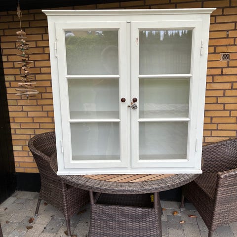 Vitrineskab i hvidmalet træ med to glaslåger på fronten. Skabet har flere indvendige hylder i træ, som egner sig til opbevaring og udstilling af glas, service eller andre genstande. Nederst findes en udtræksskuffe med greb til ekstra opbevaring. Skabet står på runde fødder og har klassisk profilering foroven. Velegnet til brug i stue, spisestue eller køkken-alrum som opbevarings- og udstillingsmøbel.