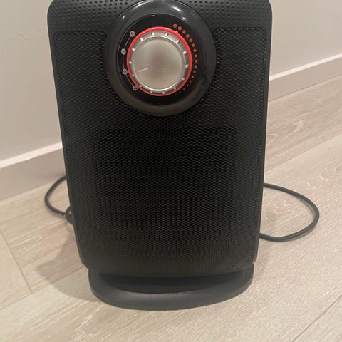 Honeywell varmeblæser i hvid plast. Enheden har to drejeknapper på toppen til indstilling af varme- og blæserniveau samt en indikatorlampe på fronten. Bagpå er der bæregreb og ventilationsgitter samt fastmonteret ledning med stik. Velegnet til opvarmning af mindre rum eller som supplerende varmekilde i hjemmet.