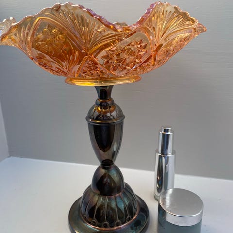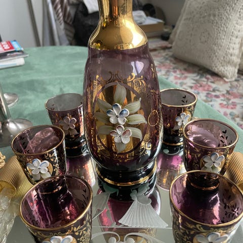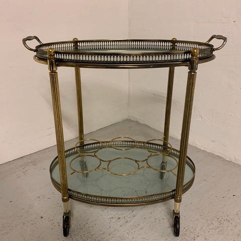 Elegant vintage serveringsvogn i metal og glas. I flot stand, dog med to mindre ridser i øverste glas og guldet er forsvundet lidt nogle få steder (se billeder). Perfekt som barbord, sidebord eller dekoration.