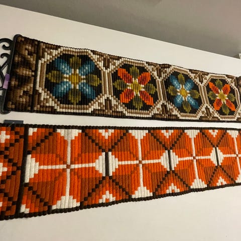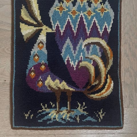 uglemotiv broderi billede i ramme. Vægdekoration med ugle og to unger på gren, udført som broderi/ i flerfarvede garnnuancer. Indrammet i rektangulær træramme med profileret kant.
