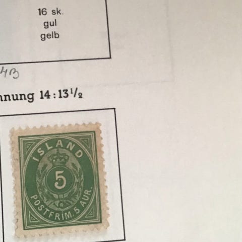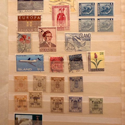 Island frimærkesamling med ældre udgaver monteret på albumark. Samlingen omfatter forskellige pålydende værdier i flere farver og motiver, primært stemplede mærker. Mærkerne er ordnet kronologisk efter årstal og serier, som det fremgår af albumarkenes trykte felter og årstal. Velegnet som grundlag for videre opbygning af en samling af islandske frimærker eller som supplement til eksisterende samlinger.