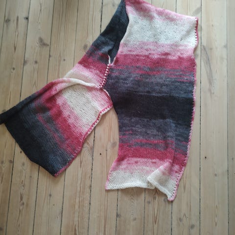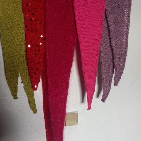 18 strikkede ringe i flere farver og lidt varierende længde. Kan evt. bruges som halsedisse, halsudsmykning.