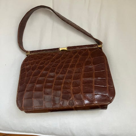 Krokodillehåndtaske, i originalstofetui, med 28 cm kæde.