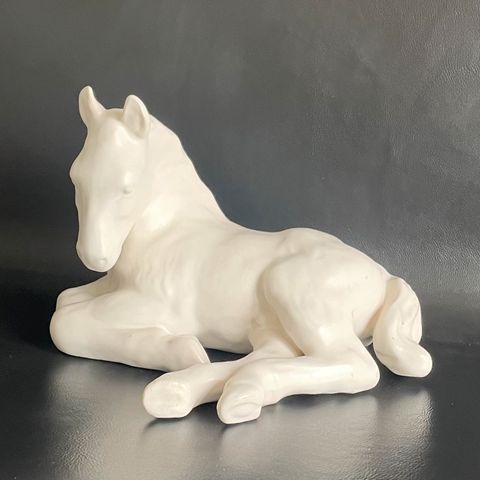 Mich Andersen figur af liggende føl i porcelæn. Figuren forestiller et føl, der ligger ned med benene trukket ind under kroppen. Glasuren er brun med nuancer og mørkere detaljer ved man og hale. Underside har mærkat og modelnummer. Velegnet som dekorativ figur i stue, reol eller vitrineskab.