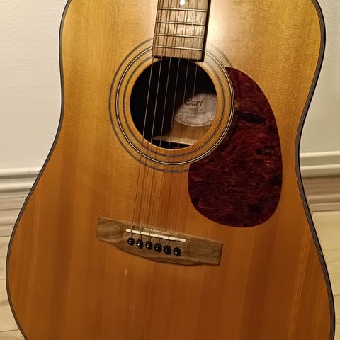 Washburn D12n, Western guitar god at spille på. Her kan man høre ægte 80'er lyd, meget harmonisk. Meget let at spiller på. Fint for sangskrivning og optræden. Søde 80'er farver. Flot patina og et par buler, der giver den autentisk karakter. Stemningsfuld reparation af halse og dermed lav prisen.