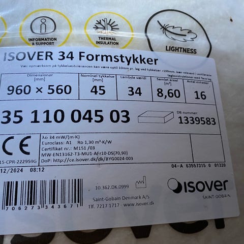 Isover Formstykker isoleringsplader med mål 960 x 560 x 195 mm. Pakken indeholder 32 formstykker med et samlet areal på ca. 1,61 m². Velegnet til isolering af konstruktioner, hvor faste plader i mineraluld ønskes, f.eks. vægge, lofter eller andre bygningsdele. Produktet er CE-mærket og leveres i original emballage fra Isover.