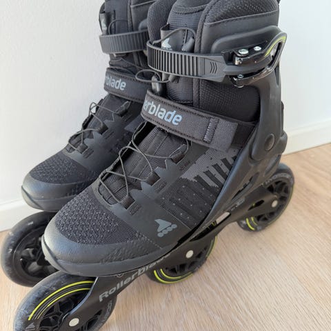 Oprindelige setup følger med. Måske brugt sammenlagt 4 timer, så stort set ingen slitage på hjul eller frames. Der følger en Rollerblade Skatebag i Sort/grå og originalt værtøj med.