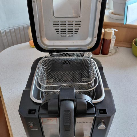 Tefal ActiFry frituregryde. Elektrisk frituregryde/airfryer med gennemsigtigt låg og aftagelig skål. Enheden har integreret omrører og medfølgende tilbehør som indsats og rist. Velegnet til tilberedning af f.eks. pommes frites og andre retter med begrænset mængde olie. Oplysninger på typeskilt: model YV9601, 220–240 V, 50/60 Hz.