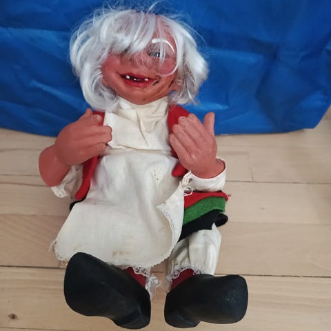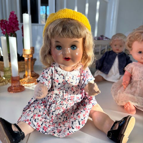 Dukke med kort, lyst hår og malede ansigtstræk. Dukken er iført lys, mønstret kjole med korte ærmer. Der medfølger strikket dukketøj, herunder orange strikket bluse og orange strikkede bukser. Egnet som legetøjsdukke eller til samling og udstilling. Ca 40 cm lang. Gammel plastik dukke.