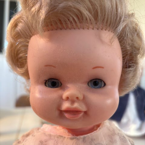Dukke med kort lyst hår i kjole og jakke