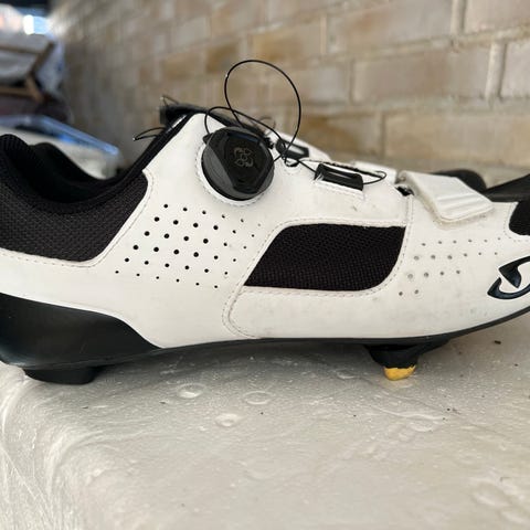Giro cykelsko i størrelse 45 i sort. Skoene har tre velcrolukninger og ventilationsfelter i overdelen. Sålen er udstyret med Look klamper til klikpedaler. Absolut fin stand. Sælges også uden klamper (minus 50 kr.)