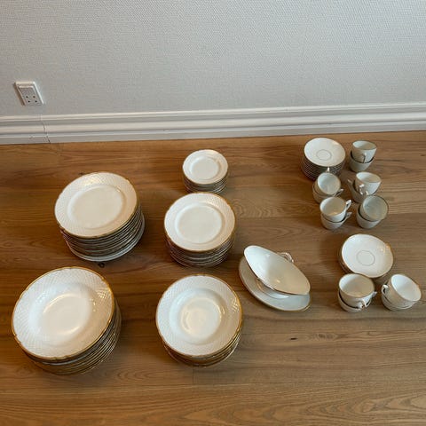 Bing & Grøndahl porcelæn stel i hvidt porcelæn med guldkant. Stellet omfatter forskellige dele som dybe og flade tallerkener, serveringsskåle og fade. Klassisk, hvid glasur med profileret reliefdekoration og påført guldkant langs randen. Velegnet som middagsstel eller serveringsstel til borddækning ved hverdag og fest. Alle dele er stemplet Bing & Grøndahl på undersiden. Alle tallerkener og fade mv. har været opbevaret med stof mellem delene og derved undgået enhver form for skår. Det består af 12 stk: Frokost -, flade - og dybe tallerkener. Plus sovseskål, kartoffelskål, stegefad og senneps bæger med låg, samt 6 stk. askebæger/lysestage