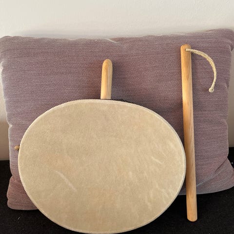 Håndlavet tromme i træ med udskårne dekorationer. Den er hjembragt fra Ghana og kun "prøvespillet". Skindet er 26 cm i diameter og trommen er 65 cm høj. Lyder godt og er dekorativ.