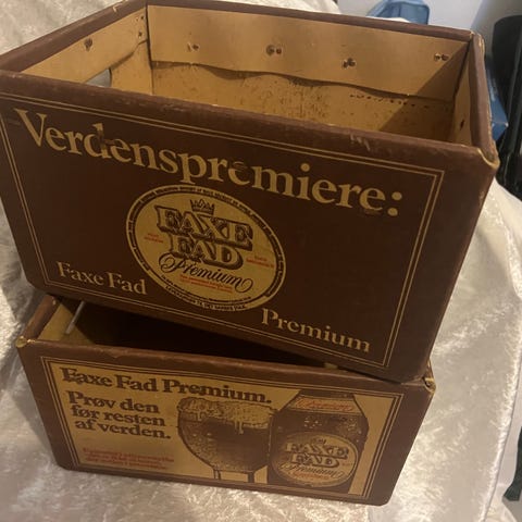Faxe Fad Premium ølkasserne fra først i 80’erne er i pap, brune med tryk. Sættet består af to papkasser med Faxe Fad Premium motiv og tekst på siderne. Kasserne har udskårne håndtag i enderne, så de er nemme at løfte. Velegnet til opbevaring eller som dekoration med øltema.