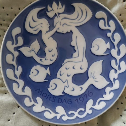 Royal Copenhagen Mors Dag platter i porcelæn 1972 og 1973. Bagsiden er stemplet med Royal Copenhagen Mother’s Day. Diameter 15cm. Sælges samlet 60kr
