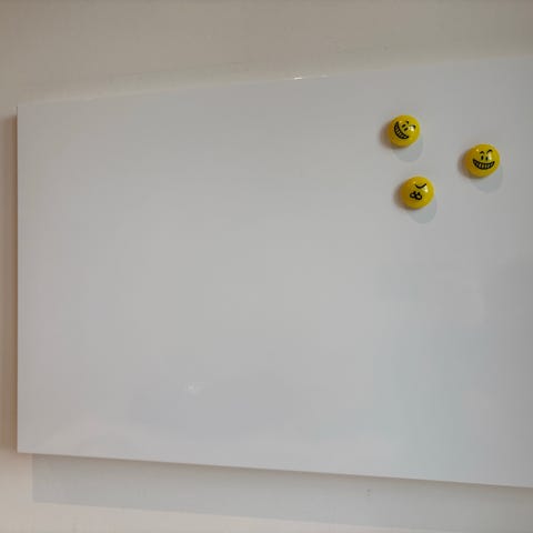 Tavlen er koksgrå med hvide bogstaver og symboler. Kommer med mange bogstaver og forskellige sjove emoji symboler.