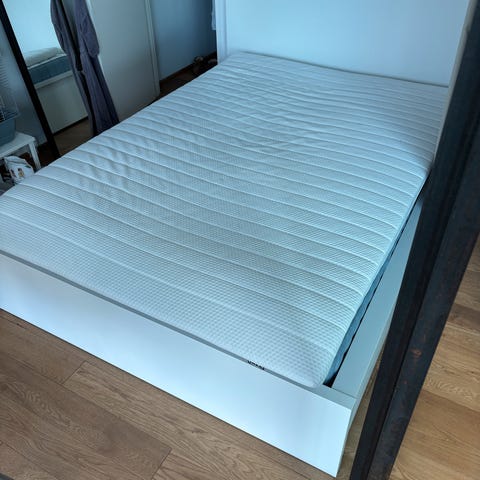 IKEA malm seng i hvid (150x210) plus en 140x200 Ånneland skummadras i fast. Skummadrassen er i to lag, hvor det første lag er memory skum, og de sidste lag er almindelig skum. Betrækket på madrassen kan tages af. Der medfølger en tynd topmadras med. Sengen har lamelbund, som giver støtte til madrassen. Rammen er i et enkelt, rektangulært design med glatte flader og lige linjer. Under sengen er der plads til opbevaring, f.eks. kasser eller skuffer. Velegnet til soveværelse eller gæsteværelse. Hovedpude og dyne følger ikke med.