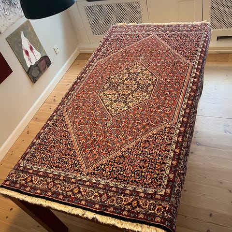 Dette er et ægte persisk Bidjar-tæppe, internationalt kendt som "Persiens jerntæppe" på grund af dets ekstremt tætte knytning og høje slidstyrke.