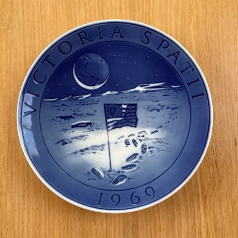 Royal Copenhagen Victoria Spatii 1969 platte i blå-hvidt porcelæn. Motivet viser Victoria Spatii månelandingen Diameter 18cm. Kan hentes i Brønshøj eller købes på Fiks Færdig.