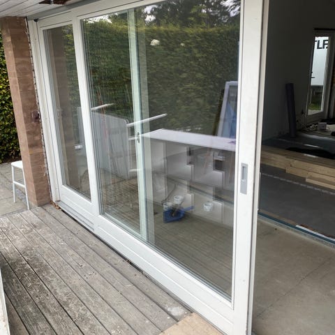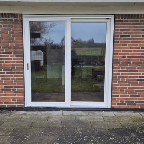 Helt ny skydedør Hvidbjerg vinduet bestilt på forkert mål. Det er thermo rude med træ/alu ramme. Sort ude, hvid inde.