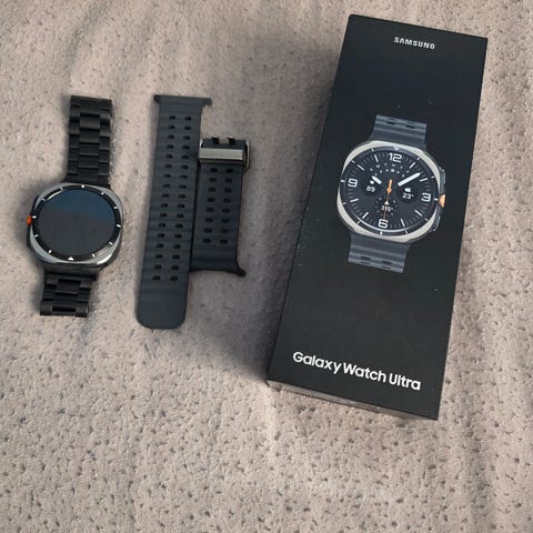 Samsung Galaxy Watch Ultra smartwatch med orange rem. Uret har firkantet urkasse og sportsrem med huller. Leveres med original æske med modelbetegnelse Galaxy Watch Ultra påtrykt. Velegnet som smartwatch til daglig brug og aktivitetsovervågning.