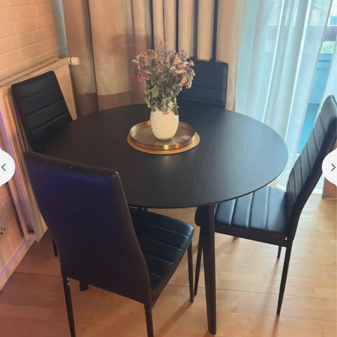 Spisebord med 4 stole. Der er mærker på bordpladen (se billede). Bord og stole er udover mærkerne i rigtig god stand.