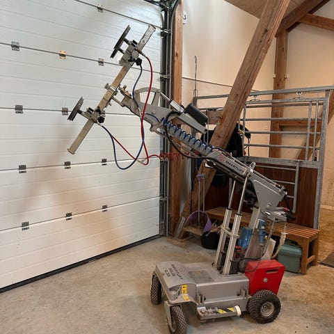 Smartlift SL 408 glasløfter med vakuumsug. Maskinen er beregnet til håndtering og montering af glas og andre plane emner ved hjælp af fire runde sugekopper på en justerbar bom. Enheden er selvkørende med brede hjul til brug på faste underlag indendørs eller udendørs. Løftearmen kan vinkles og forlænges for præcis placering af emner. Velegnet til glasmontering, facadearbejde og lignende løfteopgaver, hvor der er behov for stabil og kontrolleret håndtering af tunge ruder eller plader.