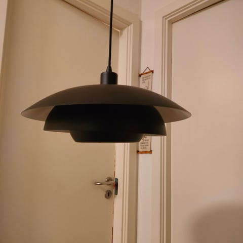 Sort stofpendel med farvet inderside - lysgrå/sølv d. 50 cm. h. 30 cm. velholdt fra røgfrit hjem. Ledning på 3,4 m. medfølger.