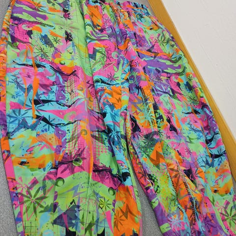 Shein bukser til kvinder i størrelse 3XL. Bukserne er fremstillet i polyester og har et multifarvet, grafisk mønster med primært mørk bundfarve og lyse striber. Modellen har elastik i taljen for bedre pasform og er vide i benene. Velegnet som hverdagsbukser eller afslappet brug. Materiale: 100 % polyester. Størrelse: 3XL (Shein Curve). Farve: multifarvet.
