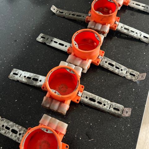 Paladeloft Dase installationsdåser, pakke med 10 stk. Produktet er beregnet til elektriske installationer og har en robust konstruktion med orange og hvide farver. Velegnet til professionel brug.