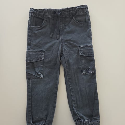 Sorte bukser med lidt svaj. De kan strammes ind i taljen.