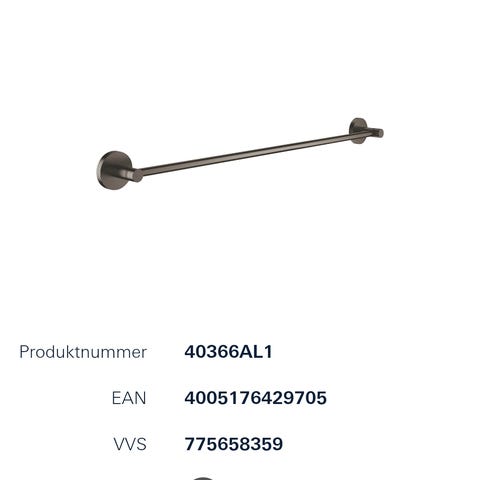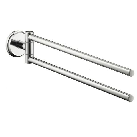 Håndklædestang i kromfinish. Modellen er monteret på runde vægbeslag. Egnet til ophæng af håndklæder på badeværelse eller gæstetoilet. Materiale fremstår som metal med blank, forkromet overflade.