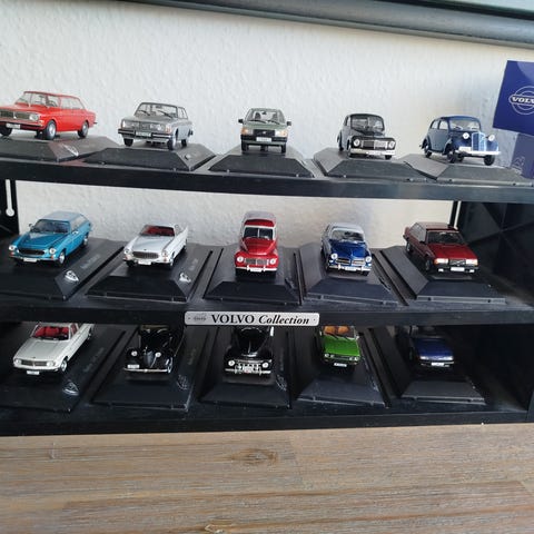 Volvo Collection sæt. Sættet består af flere æsker med biler. Hver æske indeholder en bil i miniatureudgave, egnet til samlere. Emballagen viser forskellige Volvo modeller i serien Collection. Velegnet til udstilling. Nogle af pakkerne har stadig plastik om. Sælges helst samlet. Der er 32 biler - 31 forskellige, da der er 2 Volvo P1800 ES