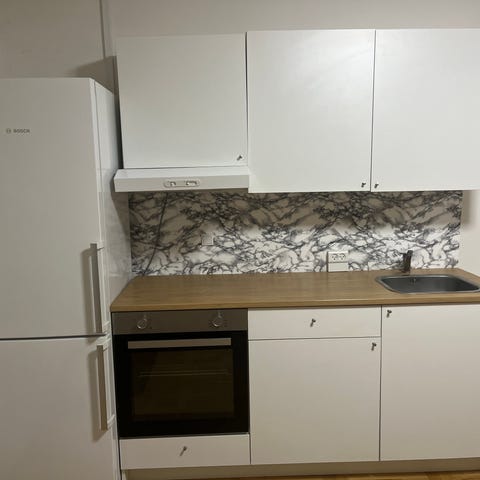 Mål 205cm for bordpladen med kogeplade (77cm bred) og 180cm for pladen med vasken. Været brugt som midlertidig løsning i et køkkenprojekt.