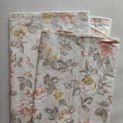 Debbie Mumm metervare stof med have-motiv. Stofstykket måler ca. 55 x 110 cm. Motivet viser blandt andet kurv med blomster, vandkande, sommerfugle, krus og bog på lys blå baggrund. Materialet fremstår som vævet bomuldsstof, velegnet til patchwork, syning af mindre projekter, puder eller dekorationer.
