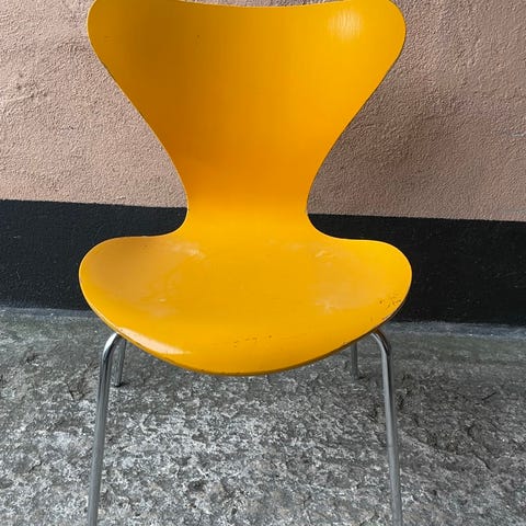 Fritz Hansen stol designet af Arne Jacobsen. Spisestol med polstret sæde og ryg i sort stof og ben i stål. Har været brugt til Piet Hein bordet på billedet. En fjerde stol i sort lakering haves ligeledes.