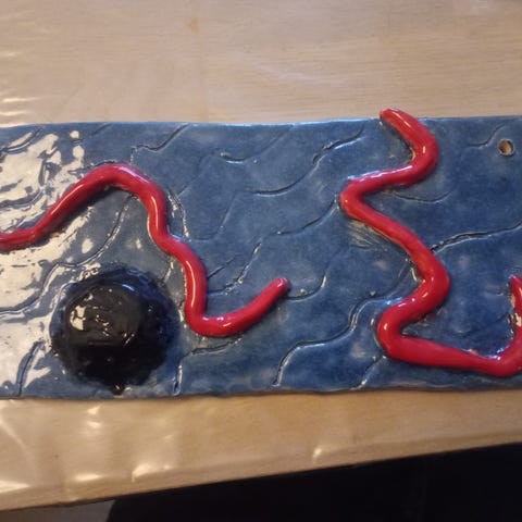 Keramiske relieffer i blå, hvide, grønne og brune nuancer. Reliefferne kan anvendes som vægdekoration i fx køkken, stue eller entré og kan hænges samlet eller hver for sig.