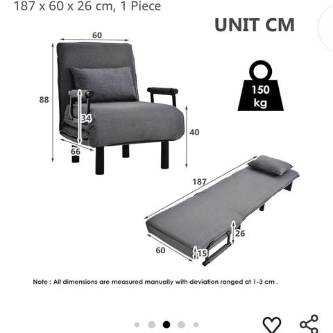 Den kan bruges som stol og chaiselongue og foldes ud til en gæsteseng (190 x 76 x 26 cm). Den er perfekt til at møblere en etværelseslejlighed eller et gæsteværelse.