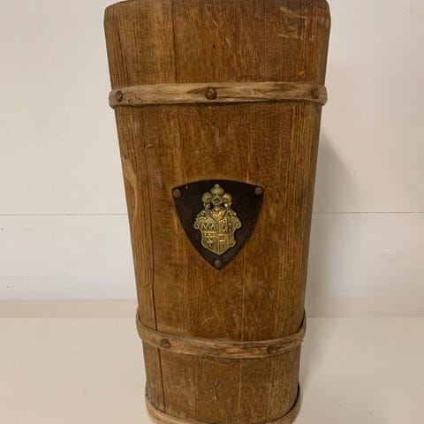 1. Tønde Høj 54 cm. Ø28,5 cm. Der er hul en på værd side, så der kan sættes reb igennem så den kan hænges op, og hul i top så der kan fyldes f.eks. slik, og konfetti i den.