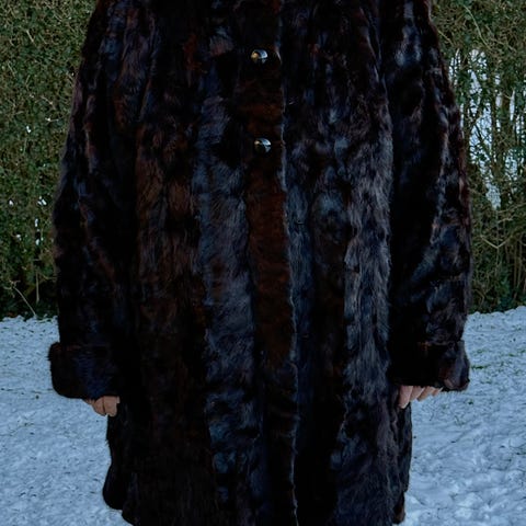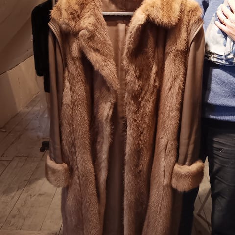 Lækker varm minkpels i et moderne snit med vidde i ryggen og en stor krave, der kan bruges som hætte. Jeg sælger den kun, fordi den er blevet for stor til mig.