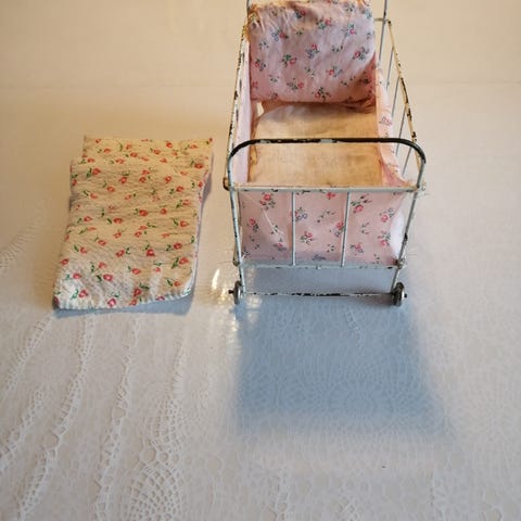Rød metal dukkevogn med hvid madras. Dukkevognen har en enkel ramme med høje sider og et håndtag til at trække eller skubbe. Madrassen er blød og polstret med en hvid betræk.
