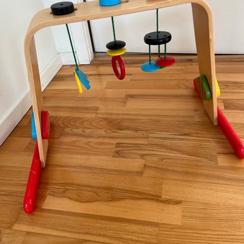 IKEA aktivitetsstativ i træ til baby. Stativet har ophængte figurer i flere farver, som barnet kan kigge på og række ud efter. Egnet til brug på gulv, hvor barnet kan ligge under stativet og træne motorik og hånd-øje-koordination.