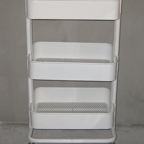 Rullebord i sort metal med tre hylder. Øverste hylde har kant hele vejen rundt, midterste hylde er udført i perforeret metal, og nederste hylde er med fast bund. Bordet står på hjul, så det er let at flytte rundt. Velegnet som opbevaringsvogn i f.eks. køkken, bad, kontor eller stue.