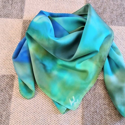 Tørklæde, håndlavet, str. 182 x 48 cm, brun, grøn, blå, rød, 100% silke, Næsten som ny, Elegant tørklæde i tyk og skinnende silke og med striber på. Af høj kvalitet. Håndlavet, formodentlig fra Thailand, Laos eller Vietnam.