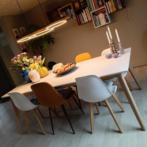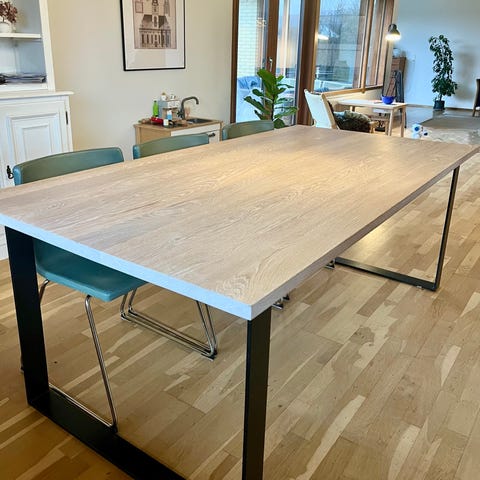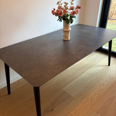 Hertil følger 6 tillægsplader a`50 cm, der opbevares i bordet, når de ikke bruges.