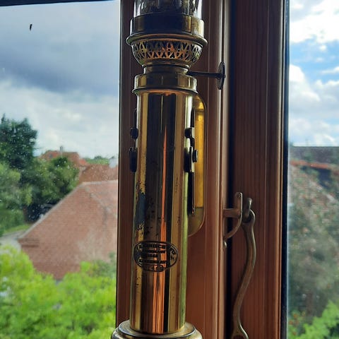 Da lampen aldrig har været i brug, står messingen knivskarpt, og brænderen er fuldstændig ren uden sod eller lugtgener.
